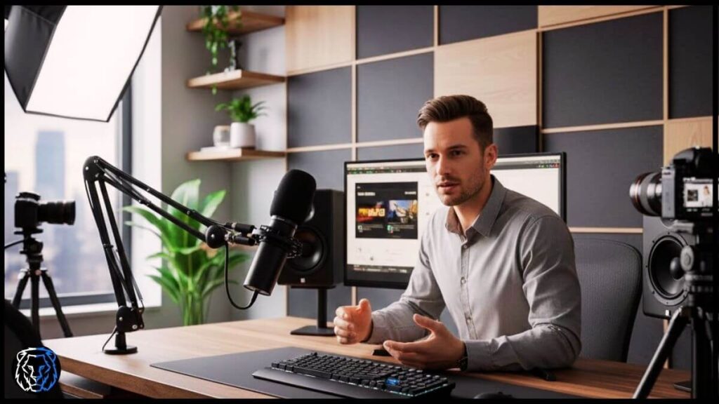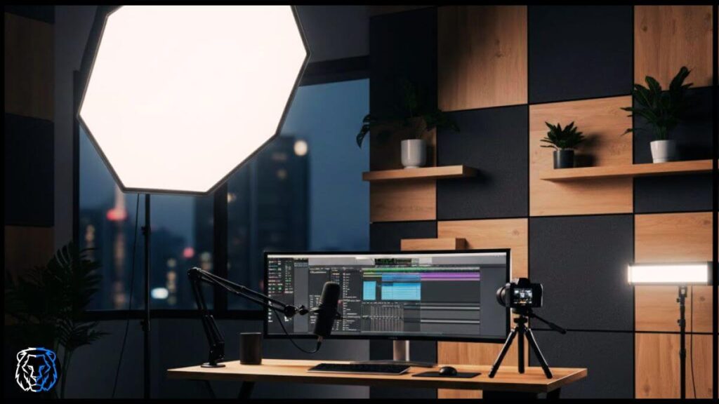 Por fim, a iluminação também serve para reforçar a identidade da sua marca. Inquestionavelmente, o uso de luzes de acento (como fitas de LED RGB ou lâmpadas inteligentes no fundo) ajuda a compor o seu cenário de forma única. Se o seu branding utiliza cores como azul ou neon, trazer esses elementos para o fundo do seu estúdio de gravação profissional em casa cria uma assinatura visual inconfundível. Portanto, a luz é o pincel com o qual você pinta a sua autoridade no mercado digital. Consequentemente, ao investir no setup correto, você não está apenas gravando aulas; você está construindo uma marca memorável e altamente lucrativa.